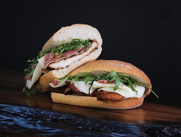 Parmigiano crusted chicken cutlet topped with aged prosciutto di parma, picante provolone, arugula, and mayo.