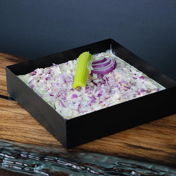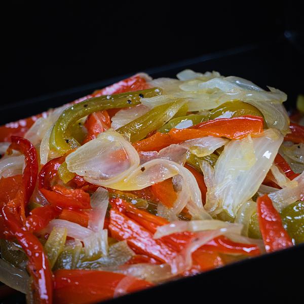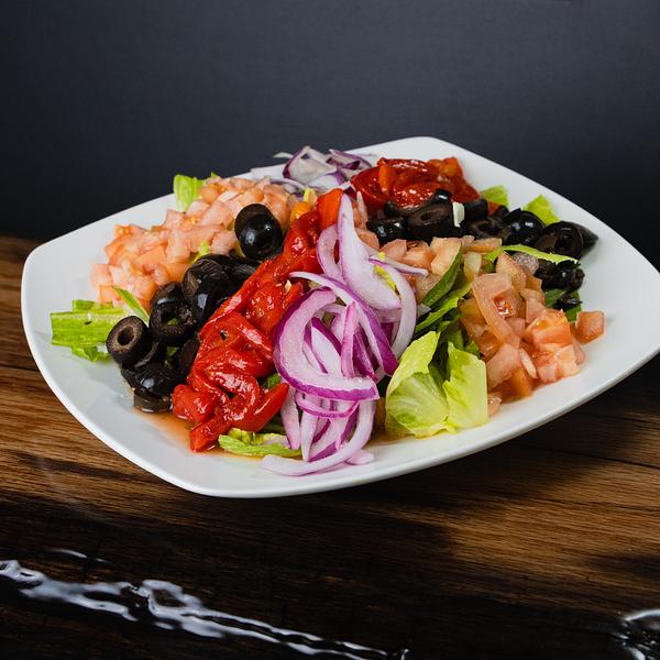Romaine lettuce, red onion, tomato, olives, and roasted red peppers.