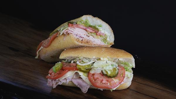 Ham, American cheese, turkey, lettuce, tomato, pickles, and mayo.