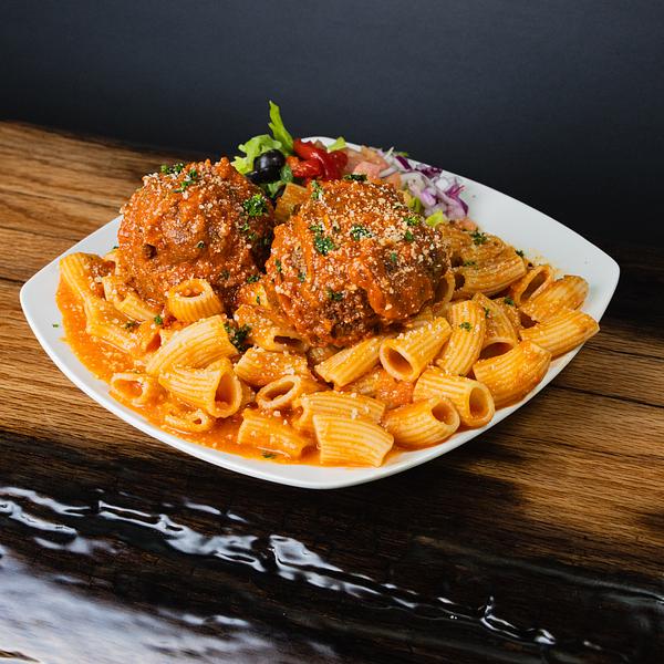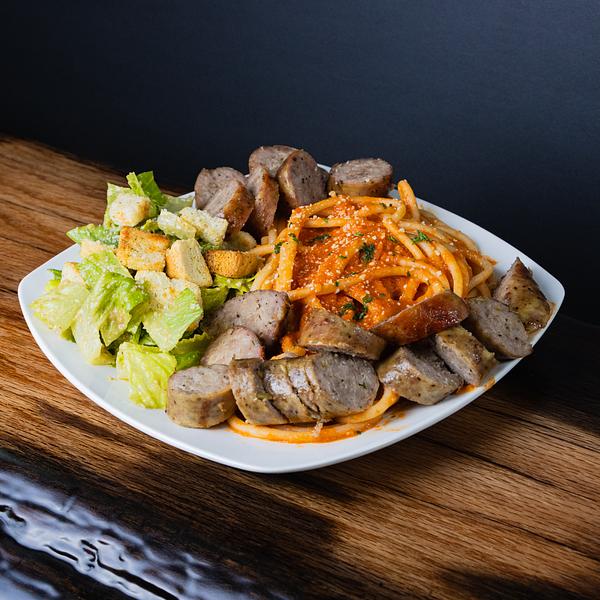 Your choice of hot or sweet sausage. Comes with a salad and pasta.
