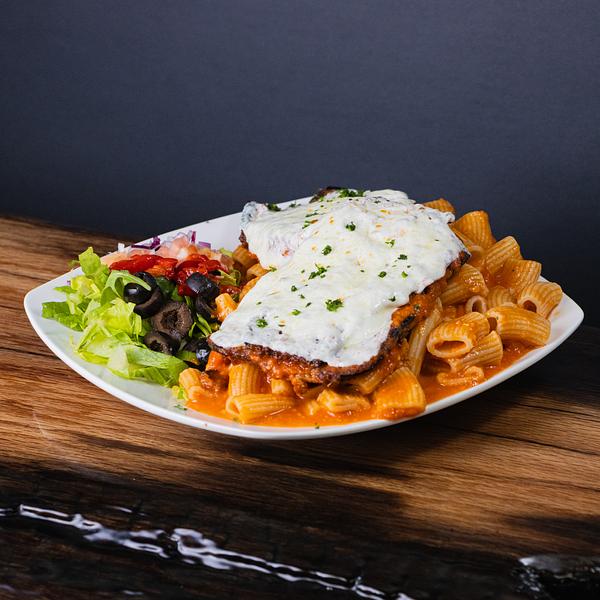 Parmigiano crusted chicken cutlet, mozzarella, and marinara sauce. Finished with grated parmigiano.