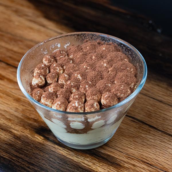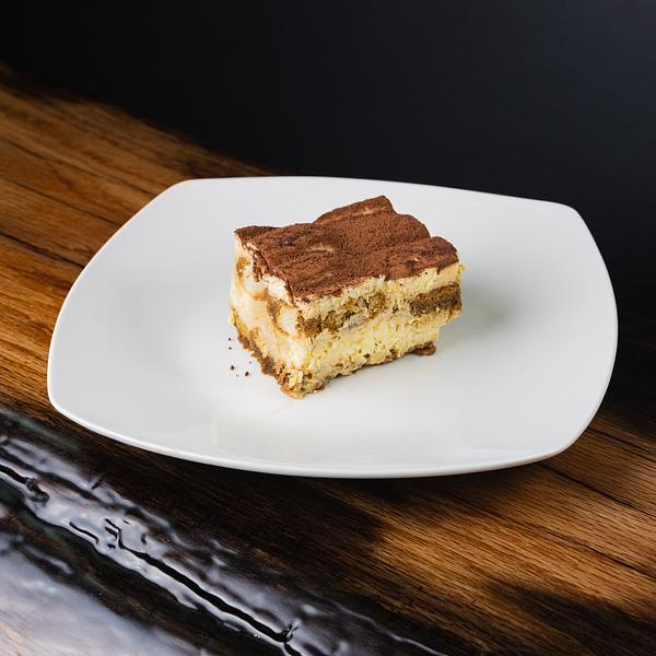 Sponge cake soaked in espresso, topped with mascarpone cream and dusted with cocoa powder.