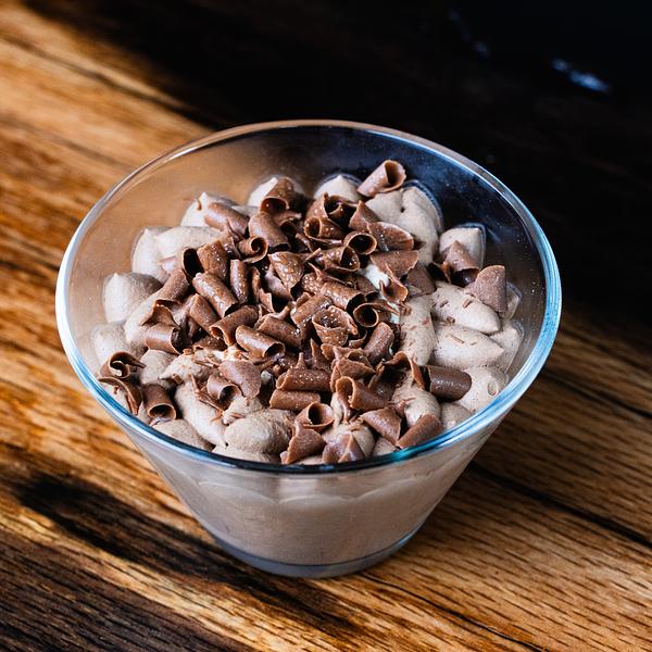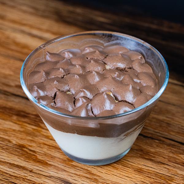 Rich chocolate mousse and zabaione, topped with chocolate curls.